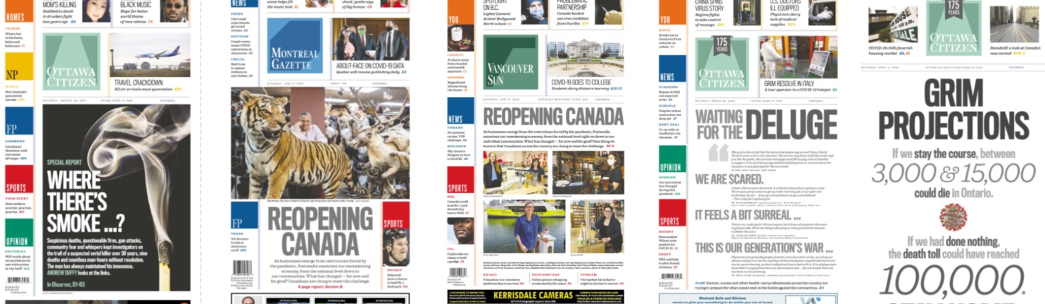 But the role of this blog is to shine a spotlight on both the publications and, when possible, people behind the designs. In this post I speak to Raina Toomey from the Postmedia Production Centre in Hamilton. It is the primary print production centre for Postmedia. I have long heard Toomey’s name. And unknowingly, I have seen her work (because it’s so anonymous). It was only luck that I stumbled upon something designed by her when I was doing a post on COVID-19 papers. She was responsible for what was probably the page of the year, in at least Canadian newspapers, on the anniversary of the declaration of the pandemic, March 11, 2021.