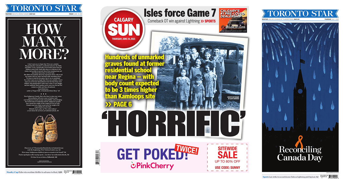 I am looking at the coverage around unmarked graves of Indigenous children being found at residential schools. Another discovery was made in Saskatchewan (after a previous discovery in B.C.) on June 23. On June 24, most Canadian newspapers dropped the ball (I will celebrate, and not critique design here, but I will critique editorial decisions). Postmedia, which has a local paper in Regina, had the story first. An example of why local news matters. Postmedia’s coverage on the first day was strong. The rest were lacking. But the next day, the Star attempted to make amends. The previous day highlights the challenges to newspapers. The story was somewhat late breaking. There wasn’t a ton of information. But, and it’s a big but, the story required more attention than it got. It was the tear-the-front-page-apart kind of story: 751 UNMARKED graves of Indigenous children were found at a former residential school in Saskatchewan. I won’t say hundreds, as every one is important. I highlight unmarked to emphasize the contempt, the lack of humanity, toward the children, the families. Here is what the Star produced the following day, Friday, June 25.