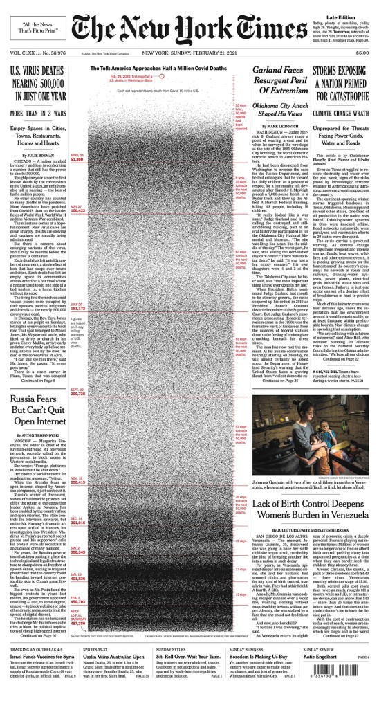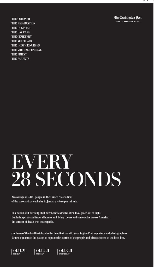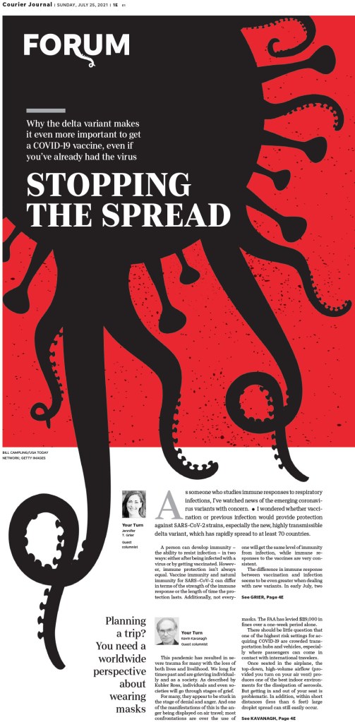 This Courier Journal (Louisville) page is so compelling and is a creative play on the COVID imagery we have seen again and again. This is new. Very clever.