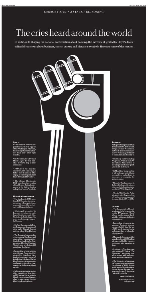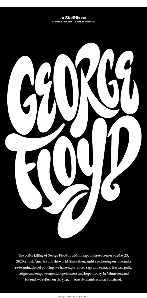 Funny thing about all of these four is that if you look at the front page each day, while they are well designed (particularly the Star Tribune, which is just a nice, clean, newsy front most days), they don’t look flashy. But then you get inside. Or then you have those big days. And wow. What is absolutely paying off for the Star Tribune is the state fair. There are always beautiful pages that come from there. To see more Star Tribune pages, other than what I’ve included here, see my recent post on designer Stacie Kammerling. A much more serious story this newspaper has handled so powerfully and with such grace is the George Floyd story. Just incredible, sensitive, yet provocative, boundary-pushing work. I will start there. Then to some fun and fair stuff (the contrast of last year’s fair and this year’s fair in cartoon figures is magical), and I have even included one of those hard-working front pages. And yes, I cut a lot again.